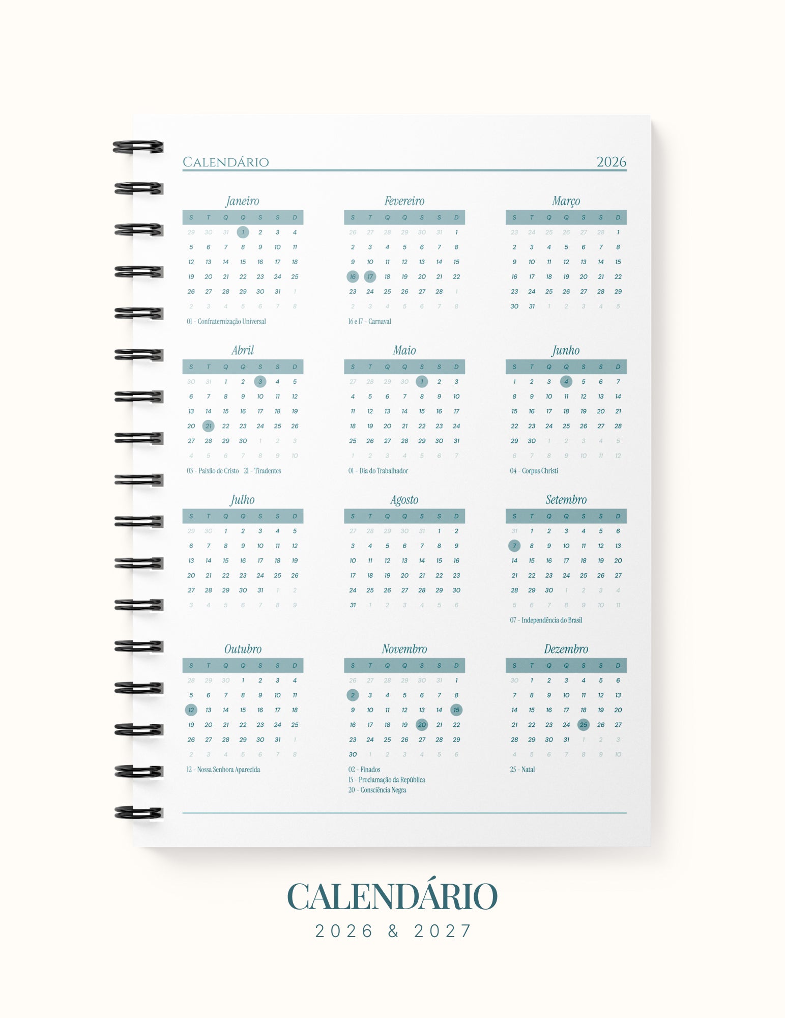 Agora com um bolso interno incrível, feito em papel premium 180g, perfeito para guardar versículos, lembretes, cartões ou pequenas recordações. Além disso, inclui duas páginas exclusivas com os calendários de 2026 e 2027 – mais organização e visão de longo prazo na sua rotina com Deus.